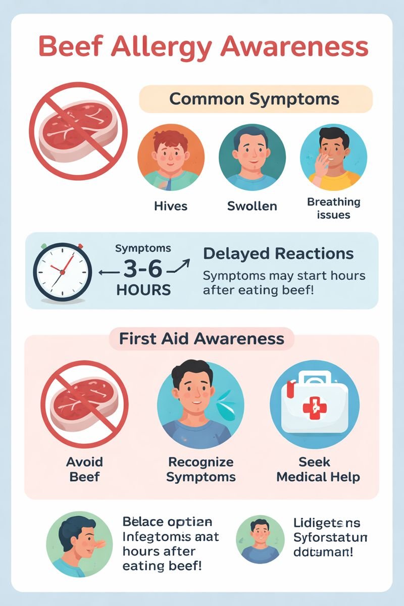 A beef allergy is an immune system reaction that occurs after eating beef or foods that contain beef ingredients. It is more commonly seen in children—especially those with cow’s milk allergy—and many children outgrow it within a few years. In adults, beef allergy can begin later in life and may persist long term. Symptoms can appear shortly after eating or, in some cases, several hours later.