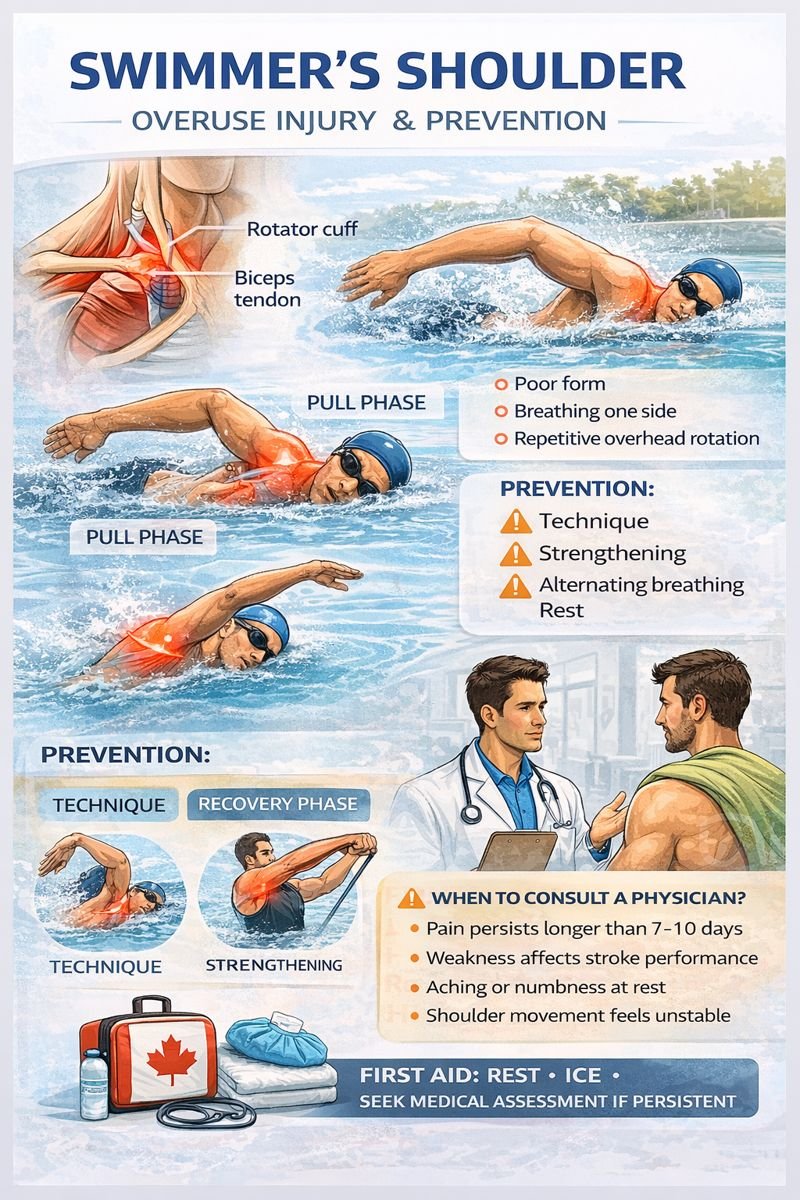 “Swimmer’s Shoulder” refers to irritation or injury affecting the muscles and tendons of the shoulder (primarily the rotator cuff) during repetitive pull-through motions.