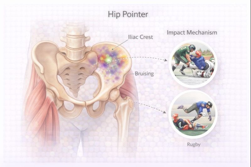 Hip pointers most often occur from a direct blow to the iliac crest. This typically happens during contact or collision sports, or during a fall where the hip strikes the ground or equipment.