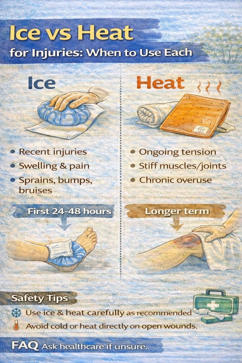 Some people use cold first for swelling, then heat later for stiffness. Guidance can vary depending on the injury.