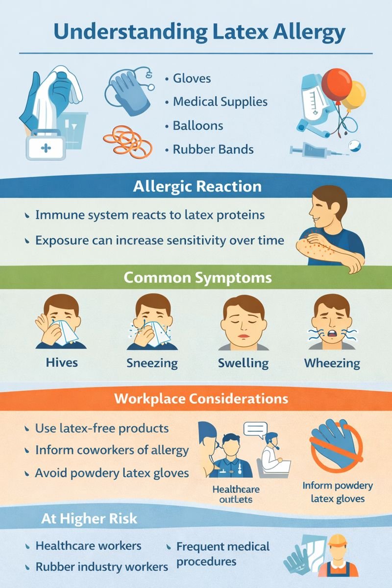 Latex allergy is especially relevant in Canadian workplaces such as healthcare, childcare, food services, cleaning services, manufacturing, and laboratories. Workers may encounter latex through gloves, equipment, or shared environments without realizing it.