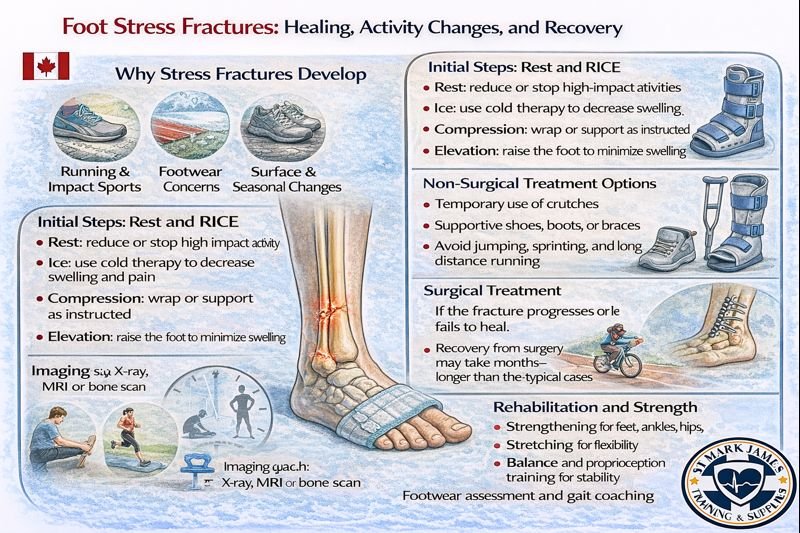 A stress fracture occurs when the demands placed on the foot exceed the bone’s ability to repair the micro-damage created during exercise. High-impact sports such as running, basketball, volleyball, and dance are common contributors. Footwear, training surfaces, and seasonal changes (such as winter-to-spring transition in Canada) can also influence risk.